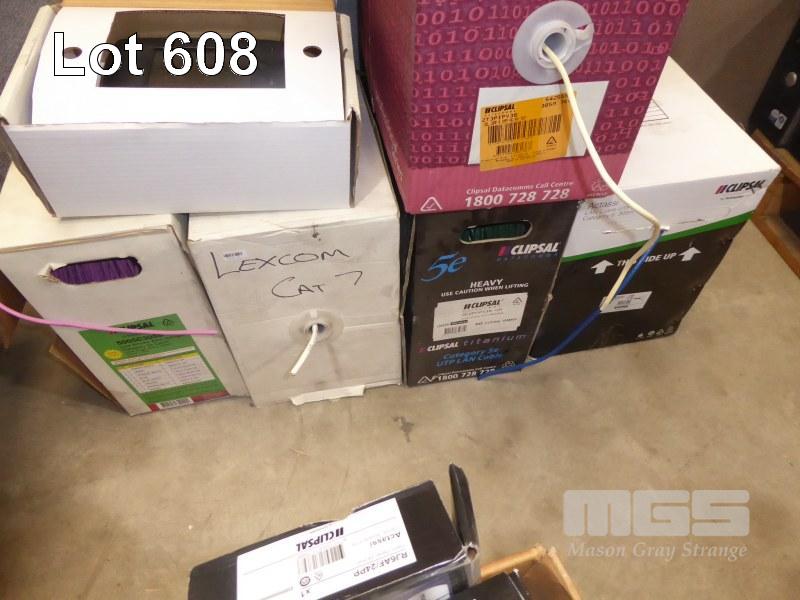 QTY PARTS ROLLS NETWORK CABLES, PHONE CABLE, PATCH PANELS, ENERGY CONTROLLER, 10A 5M EXTENSION CORDS