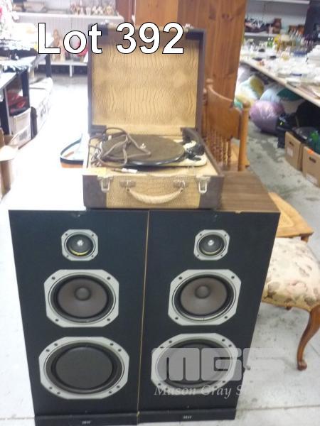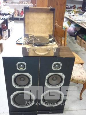 VINTAGE GIBBONS & DENHAM PORTABLE TURNTABLE & PAIR OF STEREO SPEAKERS