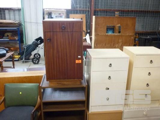 5 x ASSORTED BEDSIDE CABINETS, LAMINATE SHELF UNIT & MOBILE ARM CHAIR