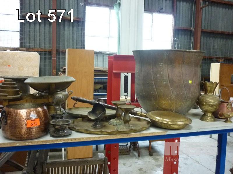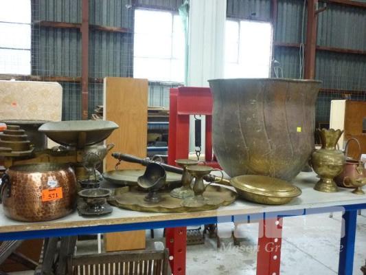 ASSORTED COPPER & BRASSWARE, SET OF VINTAGE SCALES & WEIGHTS