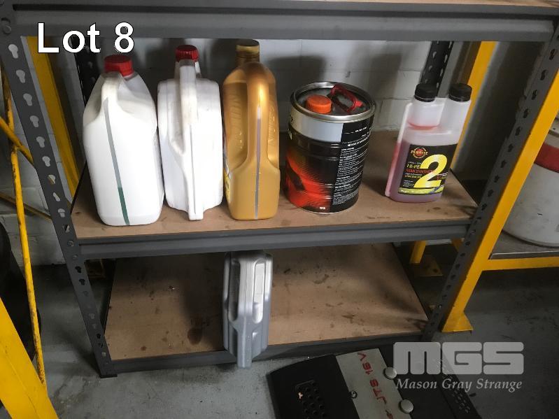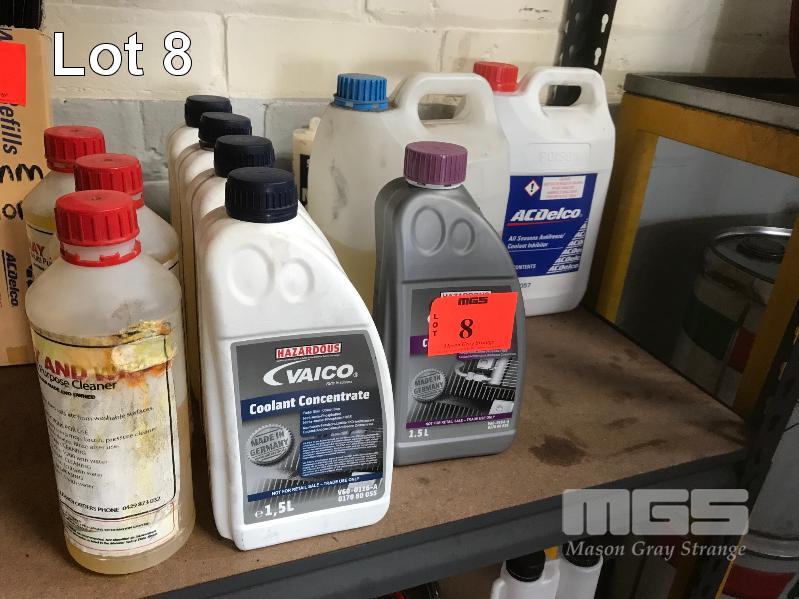 5 x 1 LITRE, 2 x 5 LITRE COOLANTS, ASSORTED & OIL, 2 STROKE & CAN