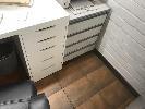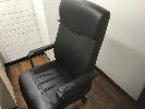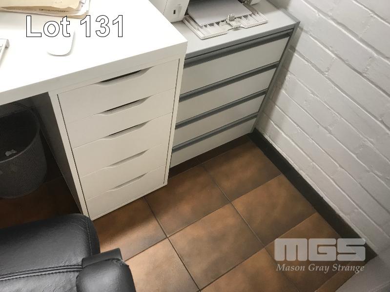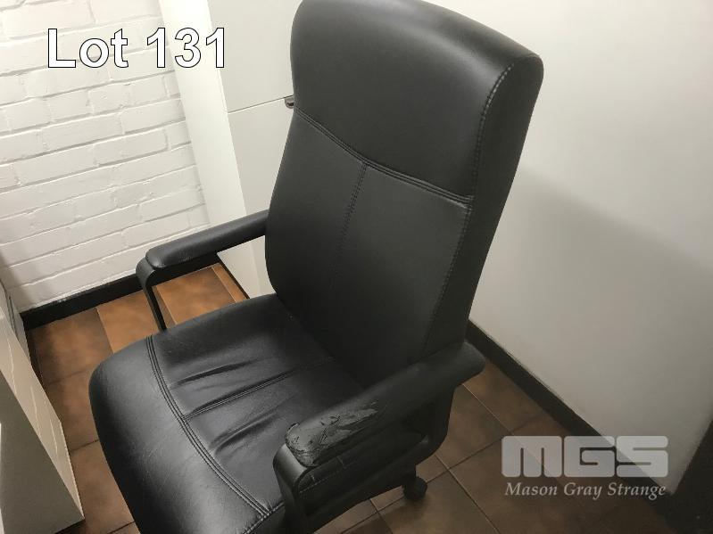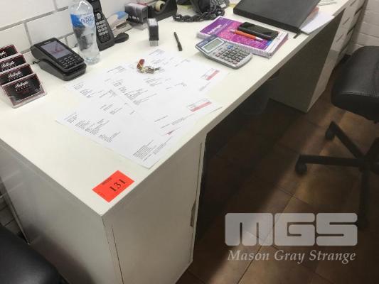 WHITE DESK & CUPBOARD, 200 x 80cm APPROX, EXECUTIVE OFFICE CHAIR, BLACK VINYL, GREY TIMBER LAMINATE 4 DRAWER MOBILE