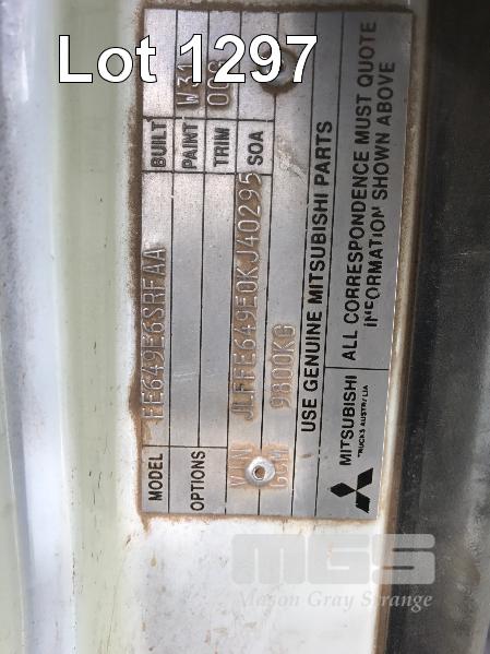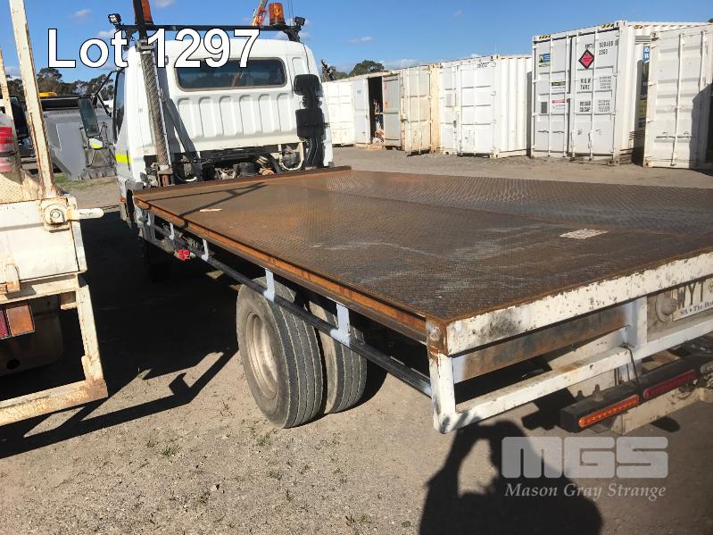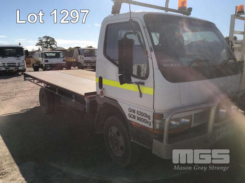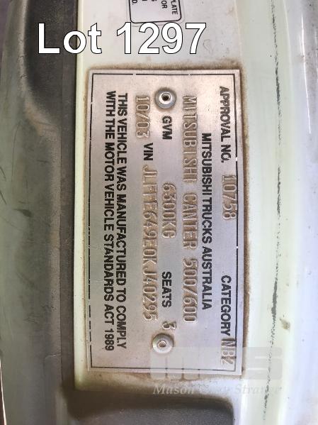 2003 MITSUBISHI CANTER 500/600 4x2 TRAY TOP REG: WYT 667 (SA) VIN: JLFFE649E0KJ40295 ODO: 328,026kms INDICATED PLANT NO: 385125 GVM: 6,300 GCM: 9,800 4 CYLINDER, 5 SPEED MANUAL TRANSMISSION, DIESEL, SPRING SUSPENSION, WHITE DUCO, 205/85R16 2 DOORS, 3 SEAT, CD PLAYER, CB RADIO, BULL BAR, DRIVING LIGHTS, STEEL RIMS, ROTATING HAZARD LIGHTS, 4.4m STEEL CHECKER PLATE TRAY, TOW BAR, BATTERY ISOLATION SWITCH KEY # Y67 (LOCATED REGENCY ROAD, FERRYDEN PARK SA) (WITH PAPERS, WITH 1 KEY/S, WITH OWNER'S MANUAL, WITH SERVICE BOOKS)