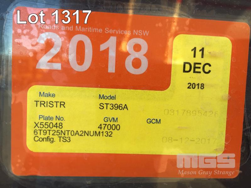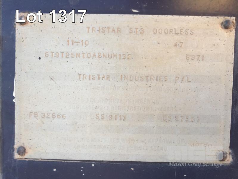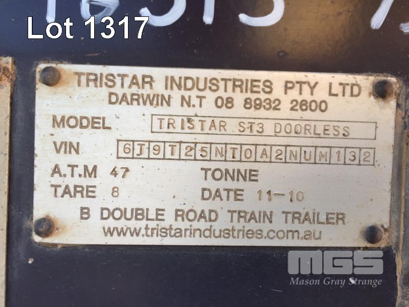 11 / 2010 TRISTAR IND ST3 DOORLESS TRIAXLE SIDE TIPPER SEMI TRAILER REG: X55 048 (NSW) VIN / CHASSIS: 6T9T25NT0A2NUM132 ATM: 47T AIRBAG SUSPENSION, 11R22.5, TARE: 8T STEEL RIMS, B DOUBLE RATED 9.2m STEEL BODY WATER TANK (LOCATED REGENCY ROAD, FERRYDEN PARK SA) (NO PAPERS)
