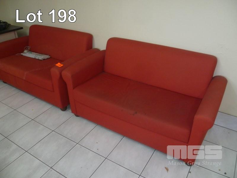 PAIR 2 SEATER COUCHES, RED, WITH 4 DOOR SIDEBOARD