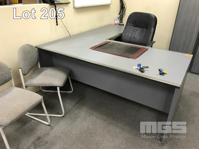 GREY TIMBER DESK & RETURN, 180 x 180cm, 3 DRAWER UNDERDESK SET, WHITE BOARD, 120 x 90cm, EXECUTIVE CHAIR, VISITORS CHAIR & LOWLINE BOOKSHELF