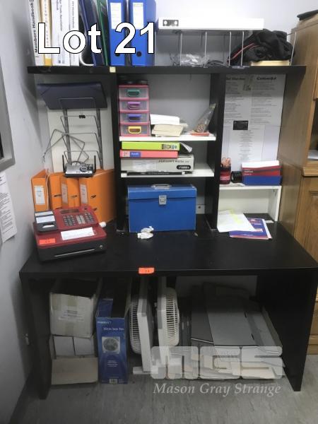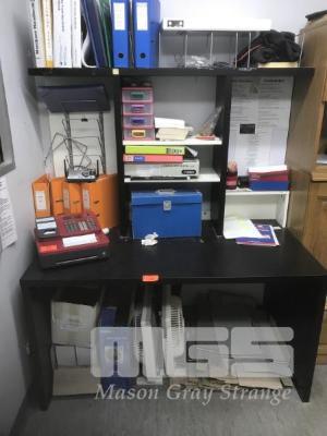 OFFICE DESK, BLACK WITH SHELVES, 140 x 73cm & CONTENTS STAITONERY, ETC