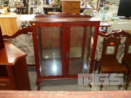 POLISHED TIMBER DISPLAY CABINET, 2 DOOR, MIRROR BACK, 2 x GLASS SHELVES