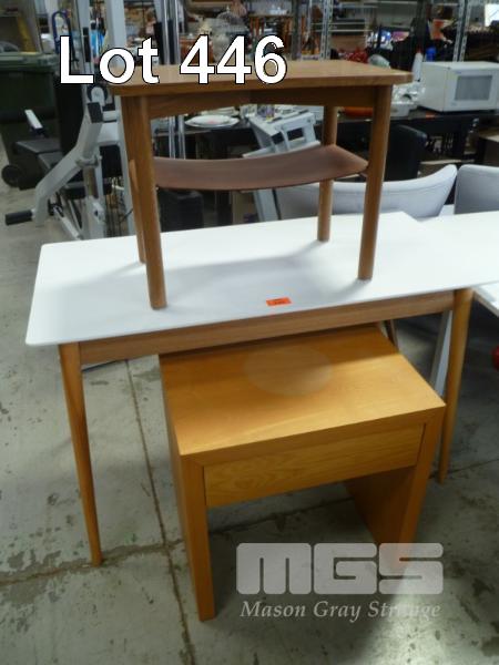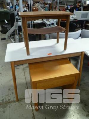 WHITE DINING TABLE, WOODGRAIN SIDE TABLE & OAK VENEERED BEDSIDE TABLE