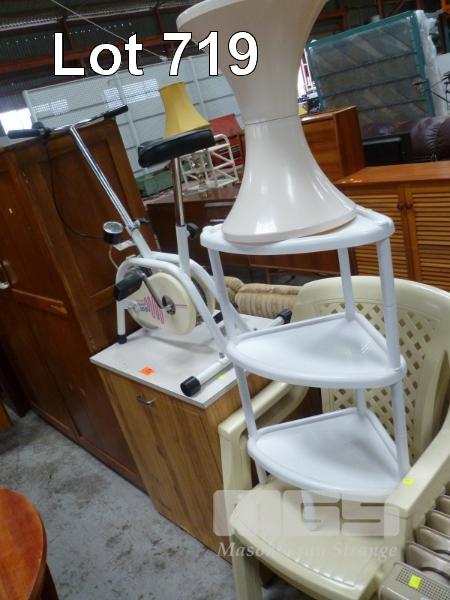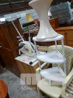 PLASTIC SHELF UNIT, CAROMA STOOL, 2 x OUTDOOR CHAIRS, LAMINATE SEWING CABINET, EXERCISE BIKE