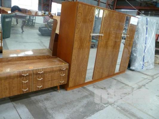 TIMBER LAMINATE 4 PIECE BEDROOM SUITE, DRESSER, 6 DRAWER, PAIR WARDROBES, 2 DOOR, DOUBLE BED WITH HEADREST (1 x DRAWER MISSING)