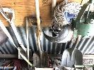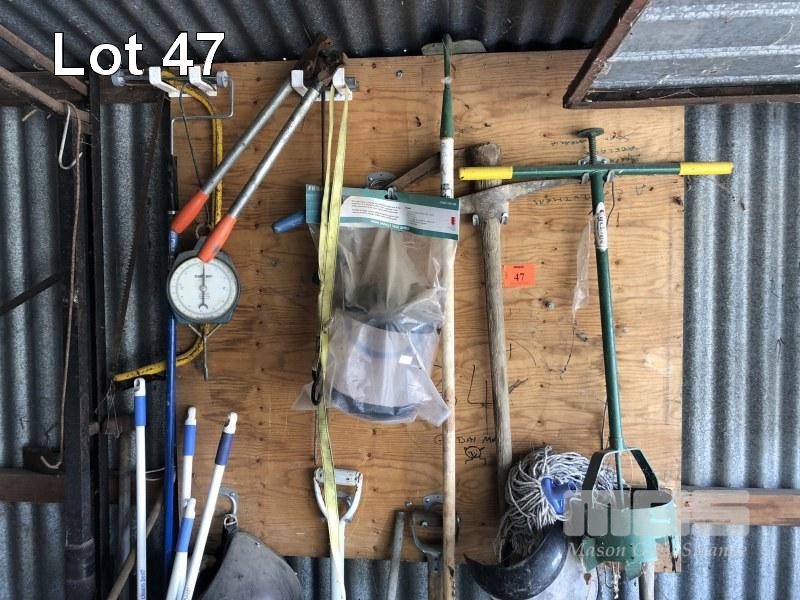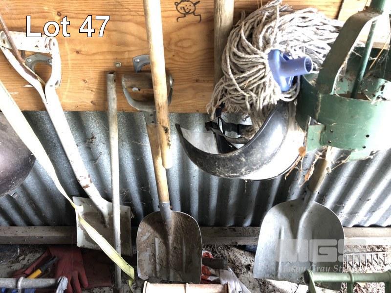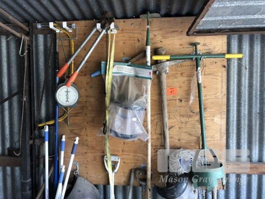SHADOW-BOARD GARDEN TOOLS, POST HOLE DIGGER, SHOVELS, SHIELDS, BROOMS ETC