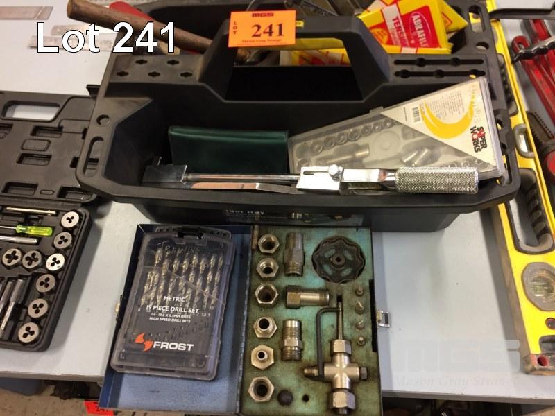 STANLEY TOOL TRAY & CONTENTS, HAMMERS 1/4 DRIVE SOCKETS, RIVETER, TENSION WRENCH & DRILL SET