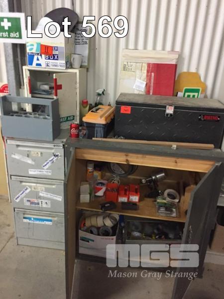 2 DOOR LOWLINE TIMBER CUPBOARD, TOOLBOX, RHINO 3 DRAWER STEEL FILING CABINET & CONTENTS, FIRST AID KIT, TOOLS & HARDWARE