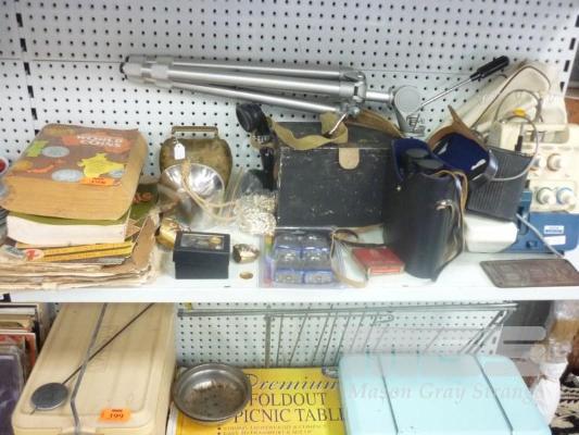 BROTHER OVERLOCKER, BINOCULARS, VINTAGE TELEPHONE, COW BELLS, TRIPOD ETC