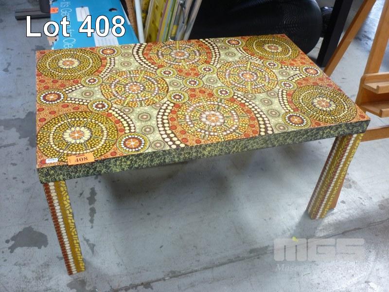 COFFEE TABLE, WITH HAND PAINTED INDIGENOUS ARTWORK SIGNED 'EY KERINGKE ARTS, SANTA TERESA, N.T 2000'
