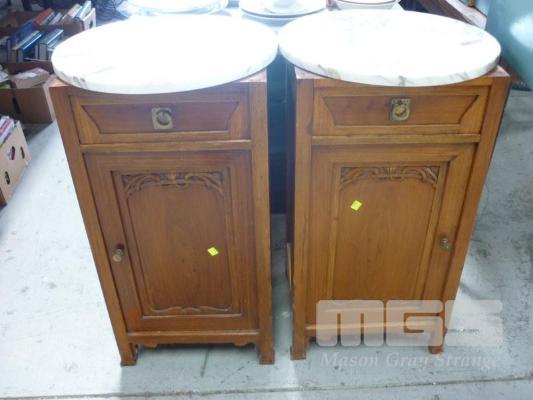 PAIR TIMBER SIDE CABINETS, 2 DOOR/DRAWER (NO TOPS) & PAIR MARBLE ROUND TOPS