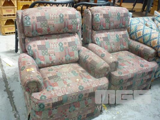 PAIR RECLINERS, PATTERNED RED/GREEN FABRIC (ARMS WORN)