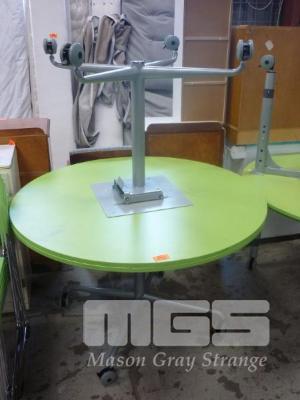 PAIR OF GREEN LAMINATE, ROUND, MOBILE, TABLES