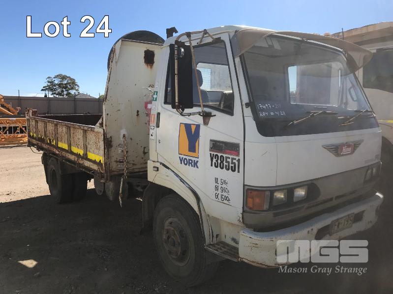 1991 HINO FC ECONO DIESEL 4x2 TIPPER REG: VFW 199 (SA) VIN: JHDFC142KXXX10380 ODO: 197,796kms INDICATED PLANT NO: Y38551 GVM: 9,500 GCM: 15,000 6 CYLINDER, AUTOMATIC TRANSMISSION, DIESEL, SPRING SUSPENSION, WHITE DUCO, 8.25R16 LT 2 DOORS, 3 SEAT, CB RADIO, HYDRAULICS, TIPPER HOIST CONTROLS, VISOR, 3.8m STEEL TIPPER WITH HINGED SIDES & 2 WAY TAILGATE, BATTERY ISOLATION SWITCH, TOW BAR, SPARE WHEEL KEY #61 (WITH PAPERS, WITH OWNER'S MANUAL, WITH SERVICE BOOKS)