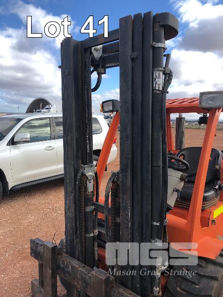 2011 MECAN MAST EXPLORER H25DSI 4WD MAST ALL TERRAIN FORKLIFT PLANT NO: HV0055 HOURS: 2,717 HOURS INDICATED CAPACITY: 2,500kg HEIGHT: 4,300mm MAX POWER SHIFT AUTOMATIC, DIESEL, 3 STAGE CONTAINER MAST (LOCATED AT PORT AUGUSTA) (NO PAPERS, NO OWNER'S MANUAL, NO SERVICE BOOKS)