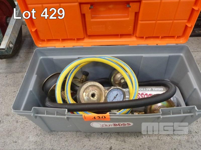 PRESSURE TEST KIT, DUAL ACTION PUMP GAUGE & ASSORTED BUNGS IN POLY TOOL BOX