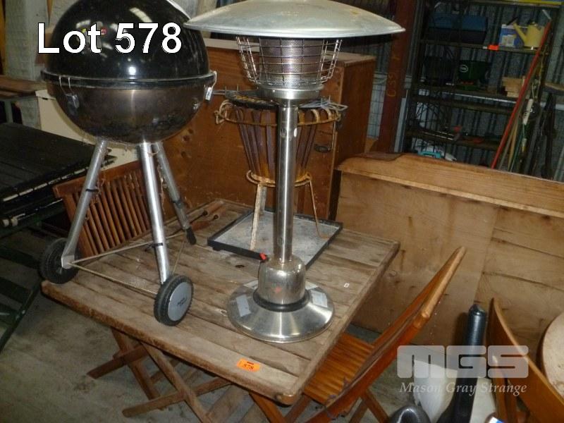 TEAK TABLE & CHAIRS, KETTLE BBQ, GAS HEATER & BRAZIER