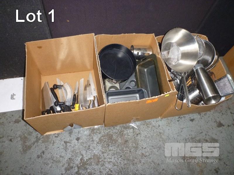 KITCHEN UTENSILS, KNIVES, BAKING TINS, ETC, 3 x BOXES