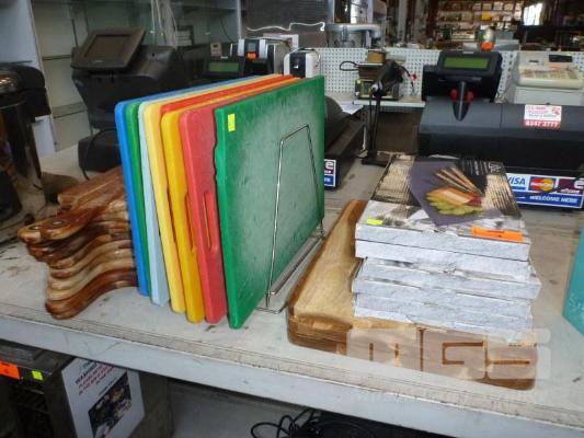 8 x PVC CUTTING BOARDS, RACK & 6 x SLATE CHEESE BOARDS