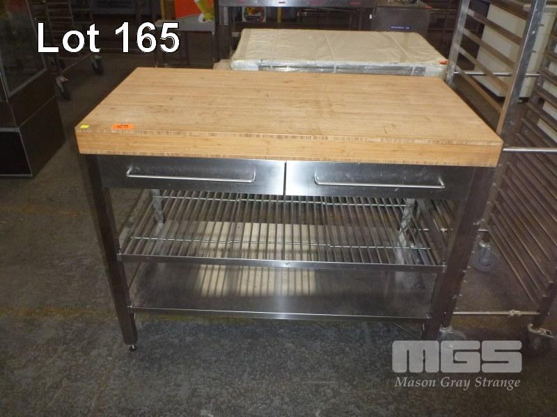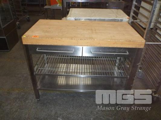 KITCHEN BENCH, 120 x 63cm, STAINLESS STEEL FRAME, 2 DRAWER, TIMBER TOP ( LOOSE )