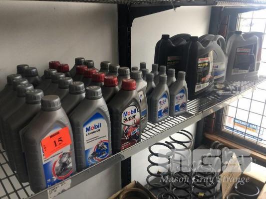 TOP SHELF:- ASSORTED AUTO FLUIDS COOLANT, ENGINE OIL, 2 STROKE OIL, MOTORBIKE OIL, MARINE 2 STROKE (APPROX 35 x CONTAINERS)