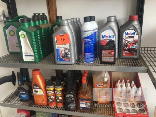 2 x SHELVES:- ASSORTED AUTO FLUIDS, OUTBOARD OILS, 2 STROKE, MOTOR BIKE OIL, COOLING SYSTEM REPAIR, STOP SMOKE & LEAK ETC