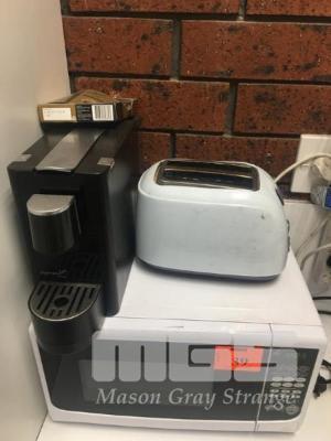 MICROWAVE, POD COFFEE MACHINE, TOASTER, KETTLE, CUTLERY, CROCKERY, FIRST AID KIT