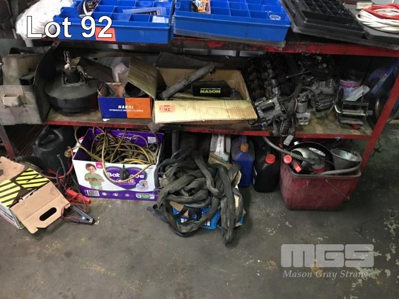 CONTENTS UNDER WORKSHOP BENCH, EXTENSION CORDS, SLINGS, HAND WINCH, DRUM PUMPS, 20 LITRE, ASSORTED AUTOMOTIVE PARTS