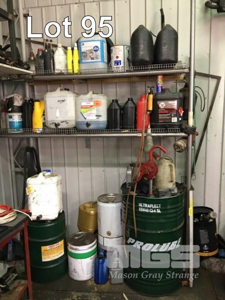 CONTENTS OR RACK INCLUDING QUANTITY OF ASSORTED AUTO FLUIDS, COOLANT, OILS, GREASE, ENGINE FLUSH, TRANS FLUID, JERRY CANS, 44 GALLON DRUM PUMP, ETC