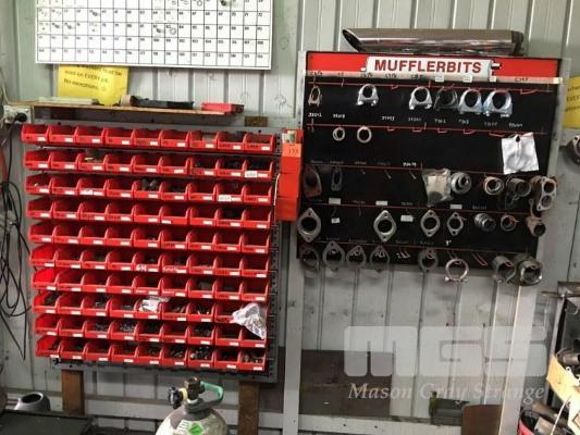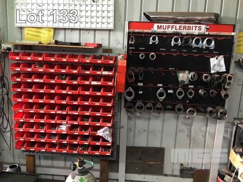 WALL MOUNT PARTS DRAWER UNIT, 90 DRAWERS, CONTENTS, STUDS, WASHERS, BOLTS, SPACERS ETC, WITH MUFFLER BITS, DISPLAY RACK & CONTENTS