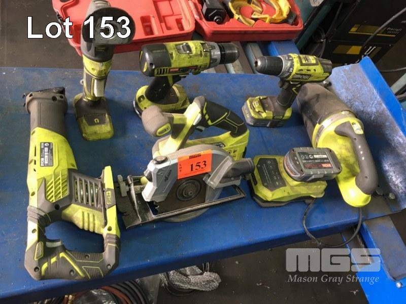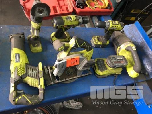 RYOBI CORDLESS WORK TOOL SET INCLUDING RECIPRO SAW MOD: RR81801, CIRCULAR SAW MOD: TWSL1801, VIBRO-CUTTER MOD: RMT 1801, 2 x DRILLS MOD: LCD1802 & EPOD1802, VACUUM CLEANER, BATTERIES & CHARGER