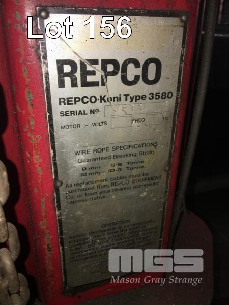 2 POST CAR HOIST, REPCO KONI TYPE: 3580 CAP: 2000kg 415V WITH WELDED OVERHEAD LIFTING FRAME & CHAIN HOIST (HARDWIRED, TO BE DISCONNECTED BY ELECTRICIAN)