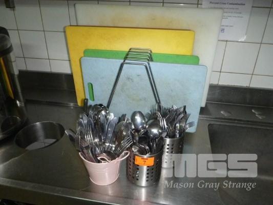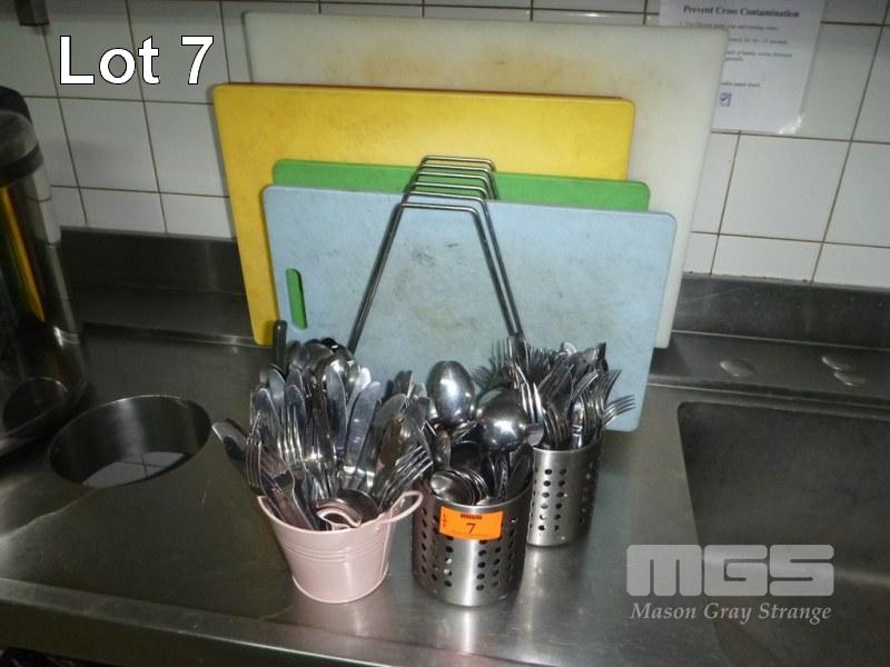 5 x PVC CUTTING BOARDS WITH STAND & QUANTITY KNIVES, FORKS & SPOONS