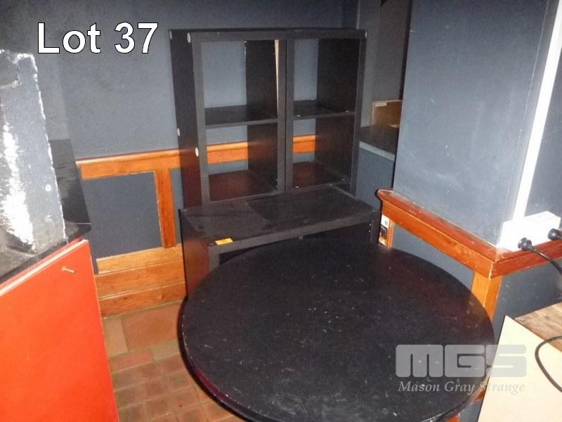 5 x ASSORTED CUBE SHELF UNITS, PEDESTAL BASED ROUND TABLE & VINYL DINING CHAIR