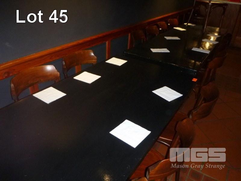 2 x CAFE TABLES, 240 x 80cm & 170 x 85cm, BLACK STAIN TIMBER TOP, PEDESTAL BASE