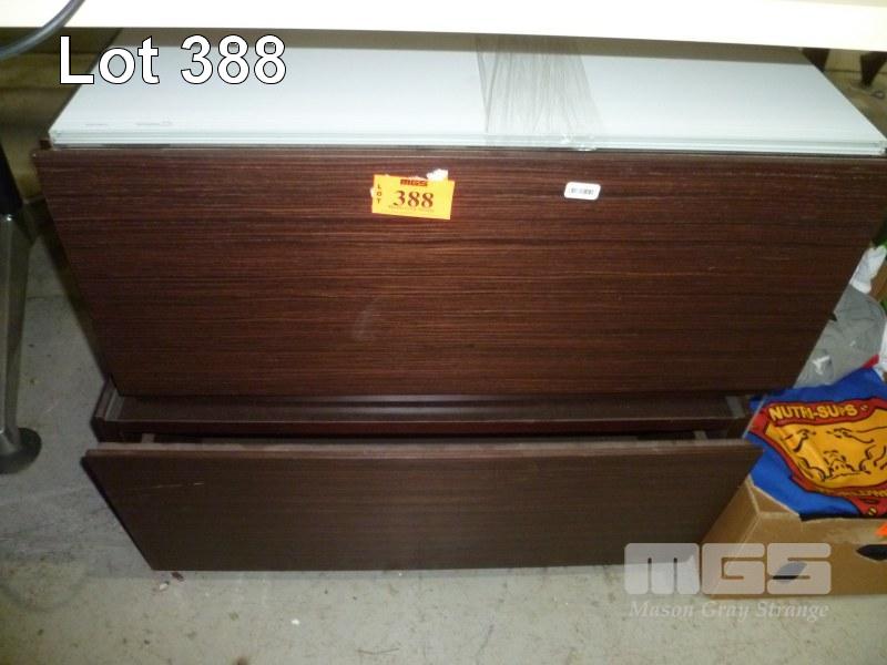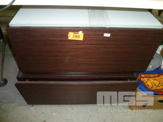 PAIR WOODGRAIN LAMINATE LOWLINE GLASS TOPPED DRAWER UNITS (1 x DRAWER - ALL FAULTS)