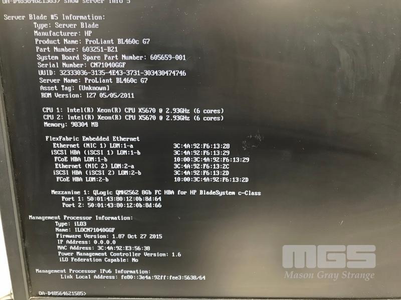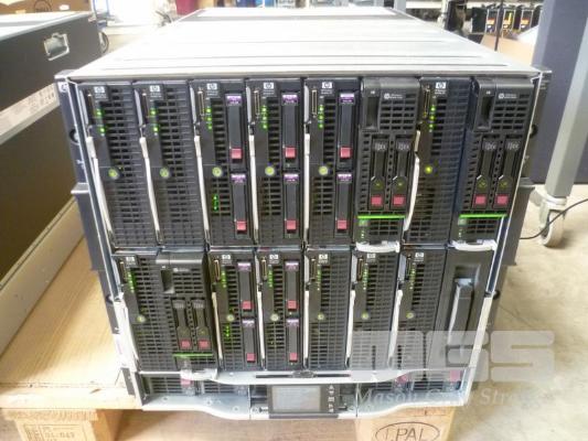 HP BLADESYSTEM c7000 ENCLOSURE G2 (507015-B21) WITH 15 x HP PROLIANT BLADE SERVERS 2 x HP VC 8Gb 24-PORT FC MODULES 2 x HP VC FLEX-10 ENET MODULES WITH RAILS & 15A EXTENSION CABLES #1 - HP PROLIANT BL490c G6, 2 x XEON X5670 @ 2.93GHz, 96GB RAM #2 - HP PROLIANT BL490c G6, 2 x XEON X5670 @ 2.93GHz, 96GB RAM #3 - HP PROLIANT BL460c G7, 2 x XEON X5670 @ 2.93GHz, 96GB RAM, 2 x 146GB HDD #4 - HP PROLIANT BL460c G7, 2 x XEON X5670 @ 2.93GHz, 96GB RAM, 2 x 146GB HDD #5 - HP PROLIANT BL460c G7, 2 x XEON X5670 @ 2.93GHz, 96GB RAM, 2 x 146GB HDD #6 - HP PROLIANT BL460c GEN8, 2 x XEON E5-2670 @ 2.6GHz, 128GB RAM, 2 x 146GB HDD #7 - HP PROLIANT BL490c G7, 2 x XEON X5670 @ 2.93GHz, 108GB RAM #8 - HP PROLIANT BL460c GEN8, 2 x XEON E5-2670 @ 2.6GHz, 128GB RAM, 2 x 146GB HDD #9 - HP PROLIANT BL490c G6, 2 x XEON X5670 @ 2.93GHz, 96GB RAM #10 - HP PROLIANT BL460c GEN8, 2 x XEON E5-2670 @ 2.6GHz, 128GB RAM, 2 x 146GB HDD #11 - HP PROLIANT BL460c G7, 2 x XEON X5670 @ 2.93GHz, 96GB RAM, 2 x 146GB HDD #12 - HP PROLIANT BL460c G7, 2 x XEON X5670 @ 2.93GHz, 96GB RAM, 2 x 146GB HDD #13 - HP PROLIANT BL490c G7, 2 x XEON X5670 @ 2.93GHz, 96GB RAM #14 - HP PROLIANT BL490c G7, 2 x XEON X5670 @ 2.93GHz, 96GB RAM #15 - HP PROLIANT BL490c G7, 2 x XEON X5670 @ 2.93GHz, 108GB RAM EACH WITH QLOGIC QMH2562 / QMH2572 8Gb FC HBA (GEN8s WITH HP FLEXFABRIC 10Gb 2-PORT 554FLB ADAPTER) S/N:SGH043XMP3