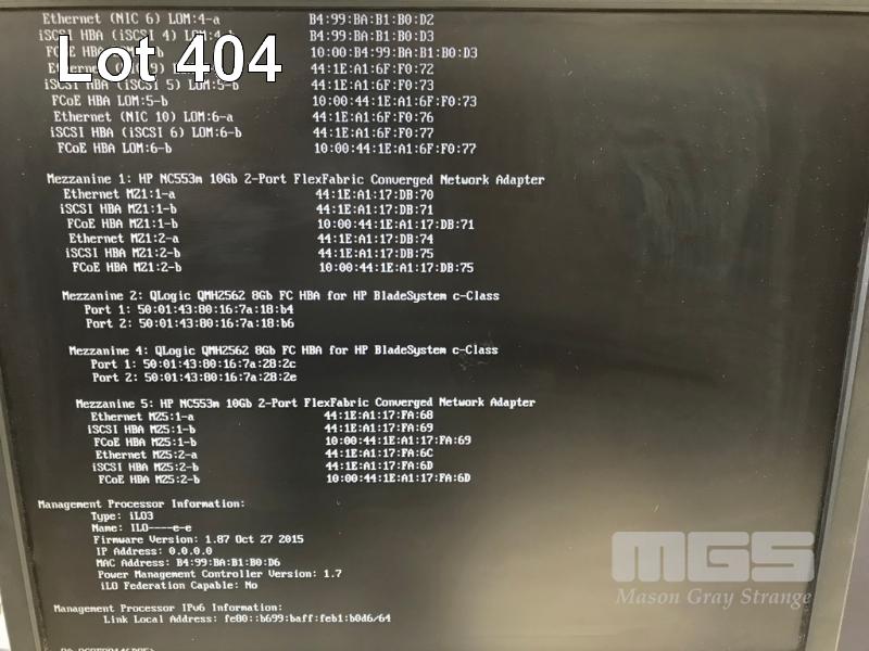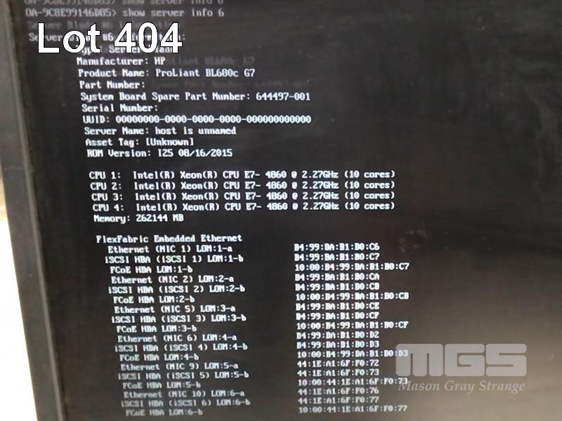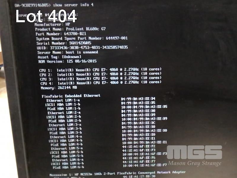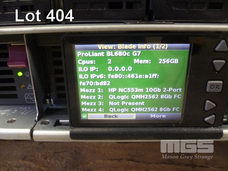 HP BLADESYSTEM c7000 ENCLOSURE G2 (507015-B21) WITH 3 x HP PROLIANT BLADE SERVERS 4 x HP VC FLEXFABRIC 10Gb/24-PORT MODULES 2 x HP VC 8Gb 24-PORT FC MODULES WITH RAILS & 15A EXTENSION CABLES #2 - HP PROLIANT BL680c G7, 2 x XEON E7-4860 @ 2.27GHz, 256GB RAM, 2 x 146GB HDD #4 - HP PROLIANT BL680c G7, 4 x XEON E7-4860 @ 2.27GHz, 256GB RAM, 2 x 146GB HDD #6 - HP PROLIANT BL680c G7, 4 x XEON E7-4860 @ 2.27GHz, 256GB RAM, 2 x 146GB HDD EACH WITH 2 x HP NC553m 10Gb 2-PORT FLEXFABRIC CONVERGED NETWORK ADAPTERS & 2 x QLOGIC QMH2562 8Gb FC HBA S/N:SGH140XMK6