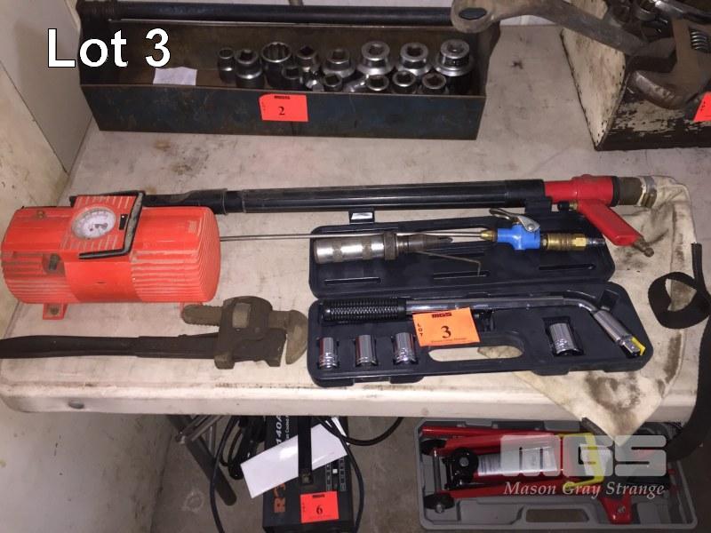 AIR COMPRESSOR, 12V, MONKEY WRENCH, IMPACT DRIVER, TYRE IRON, 6 PIECE SOCKET SET, AIR VAC WITH NOZZLE
