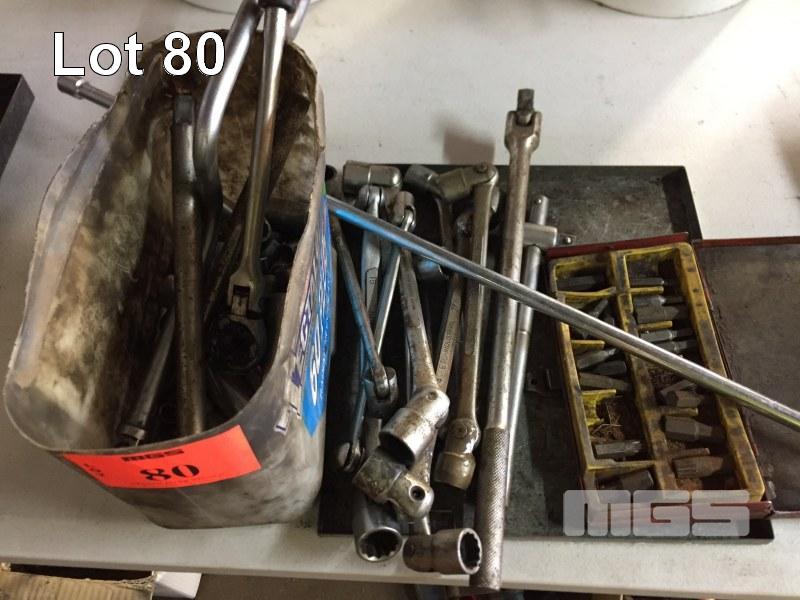 ASSORTED HAND TOOLS, SOCKET SET, SOCKET SPANNERS, DRIVER BITS, 75cm EXTENSION BAR