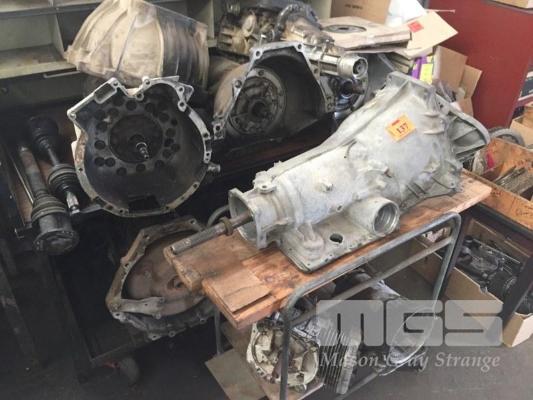 6 x ASSORTED AUTOMATIC TRANSMISSIONS, 3 x TROLLEYS, WORK BENCH WITH PIGEON HOLE UNIT, 140 x 80cm