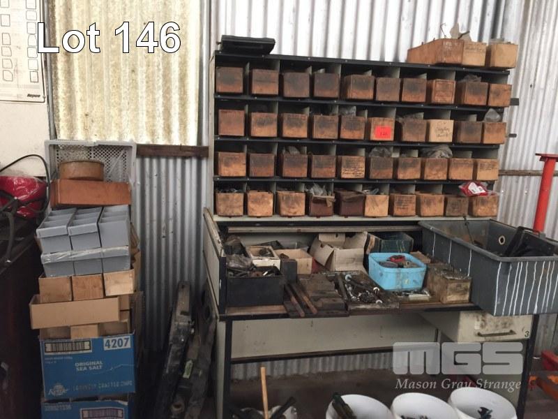 WORKSHOP TABLE, PIGEON HOLE UNIT & CONTENTS PARTS BOXES, ASSORTED AUTOMOTIVE COMPONENTS, BEARINGS, NUTS & BOLTS, RADIATORS, ETC