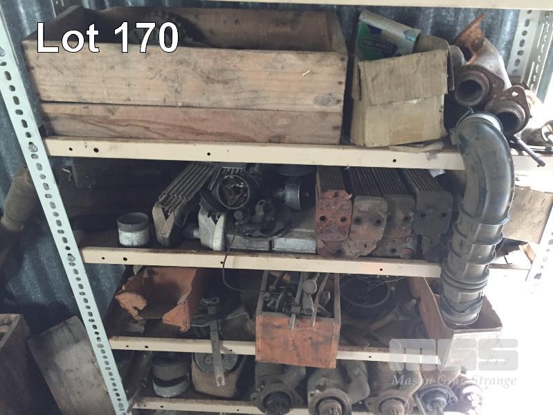 16 x SHELVES AUTOMOTIVE COMPONENTS, MANIFOLDS, EXHAUST PIPES, SUSPENSION ARMS, STARTER MOTORS, AUTO TRANS COMPONENTS, ETC, 2 x BAYS