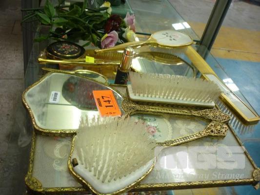 ASSORTED VINTAGE VANITY SET MIRRORS, BRUSHES, CERAMIC FLOWERS, ETC